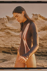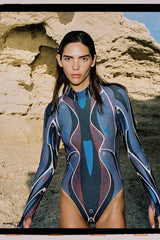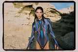 Sculpted elegance with a touch of the deep sea. The Torote Pez features a sleeveless cut, high-neck front, open back, and high-leg silhouette for an elongated, streamlined look. Its print, part of the Cardumen collaboration, captures the fluid grace of fish gliding together beneath the surface.